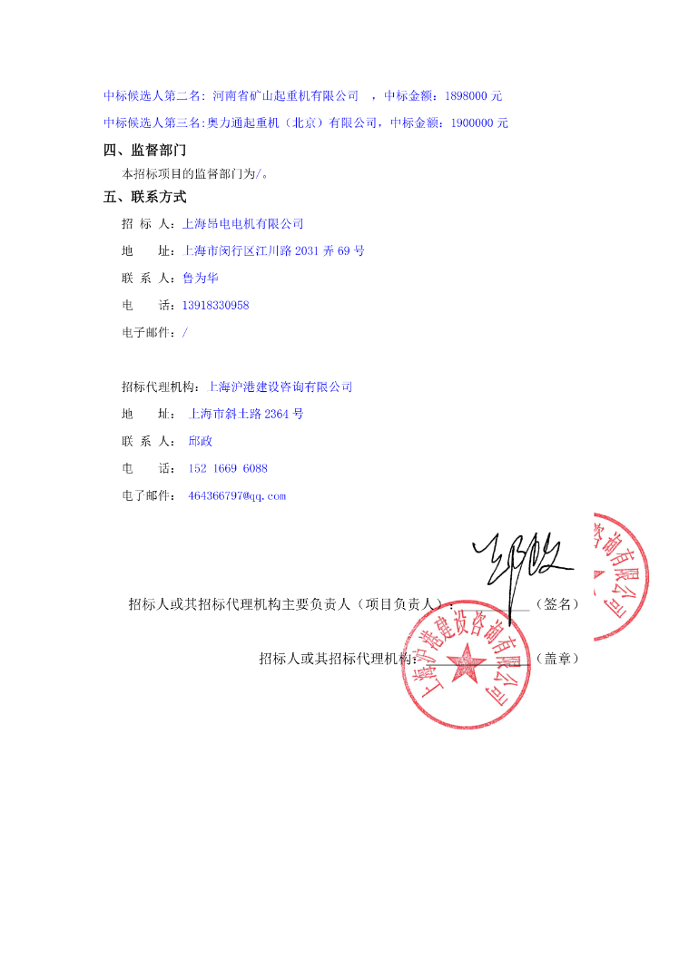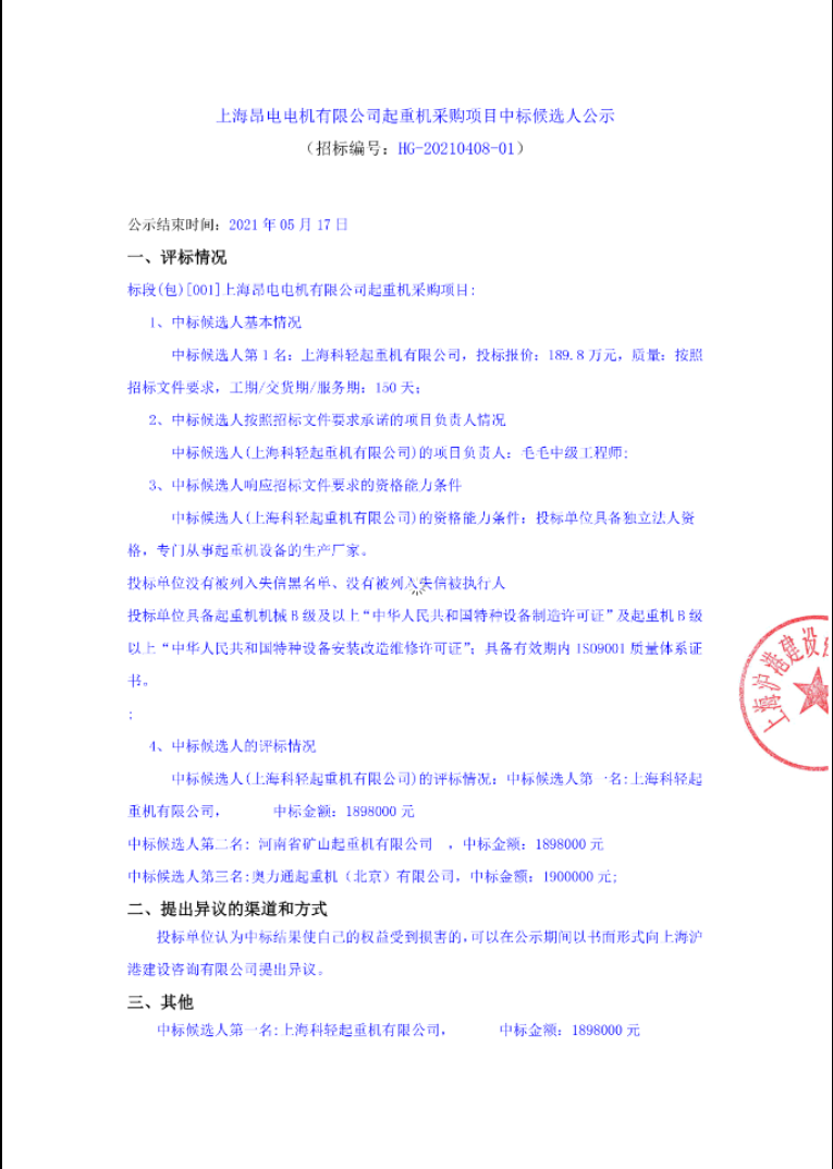 移動版:上海:昂電電機有限公司起重機采購項目中標候選人公示_