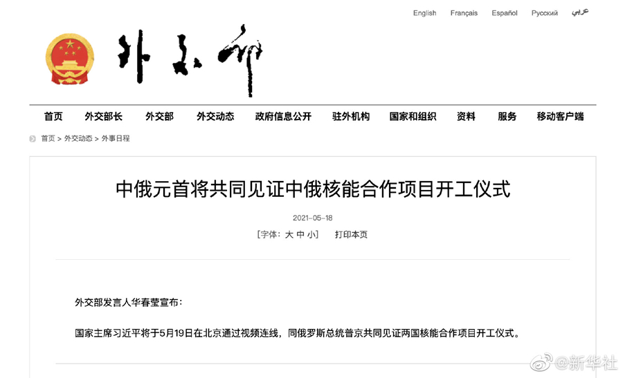 移動(dòng)版:中俄元首將共同見證中俄核能合作項(xiàng)目開工儀式
