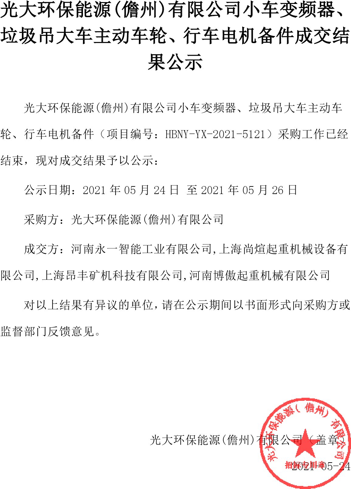 移動版:海南:小車變頻器、垃圾吊大車主動車輪、行車電機備件成交結(jié)果公示