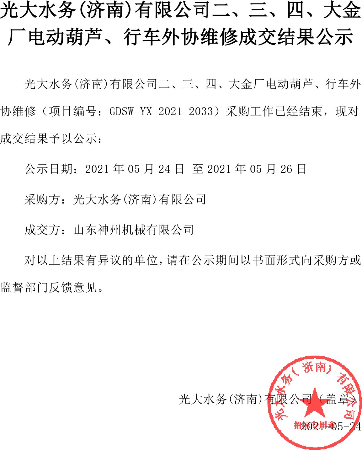 移動版:山東:二、三、四、大金廠電動葫蘆、行車外協(xié)維修成交結果公示