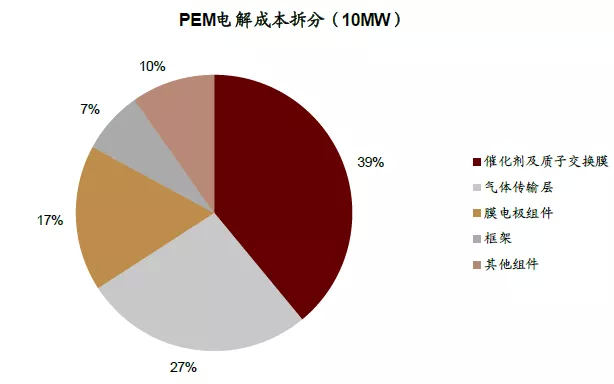 電解水制氫短期以堿性水解為主,中長期PEM電解制氫占比逐步提升。目前電解水制氫主要包括堿性電解和質(zhì)子交換膜(PEM)電解兩種主流技術(shù)路線,其中堿性電解技術(shù)相對(duì)較為成熟,已實(shí)現(xiàn)充分產(chǎn)業(yè)化,成本較PEM電解低30%。而PEM電解槽所用核心零部件及材料均與質(zhì)子交換膜燃料電池相同,未來將隨著其核心零部件的國產(chǎn)化率提升、技術(shù)進(jìn)步與規(guī)模效應(yīng)快速降本。我們認(rèn)為PEM電解技術(shù)因具有運(yùn)行靈活、利于快速變載等優(yōu)勢,與風(fēng)電、光伏具有良好的匹配性,將隨著設(shè)備快速降本市占率逐步提升。