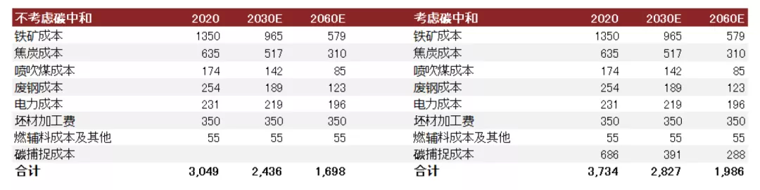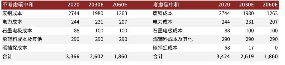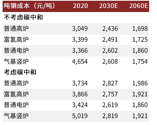 在考慮碳中和情況下,2060年普通電爐噸鋼成本有望最低