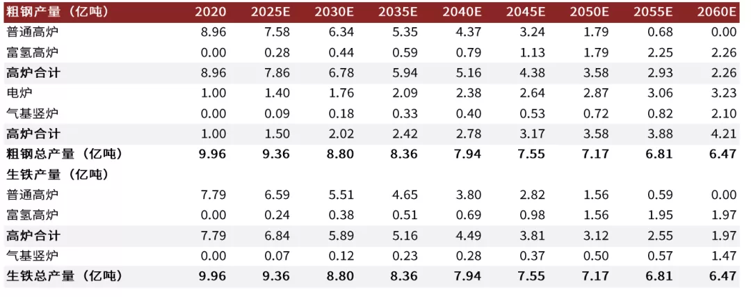 2060年生鐵將主要由富氫高爐與氣基豎爐生產(chǎn)。我們預(yù)計(jì)2030/60年國內(nèi)粗鋼產(chǎn)量約8.80億噸/6.47億噸,較2020年下降12%/35%??紤]到幾種技術(shù)在后續(xù)流程將加入廢鋼以增加粗鋼產(chǎn)量,我們測算高爐的生鐵粗鋼比約為1.15,氣基豎爐的生鐵粗鋼比約為1.43,由此測算普通高爐/富氫高爐/氣基豎爐2030年生鐵產(chǎn)量為5.51億噸/0.38億噸/0.12億噸,2060年生鐵產(chǎn)量為0億噸/1.97億噸/1.47億噸,2060年生鐵將主要由富氫高爐與氣基豎爐生產(chǎn)。