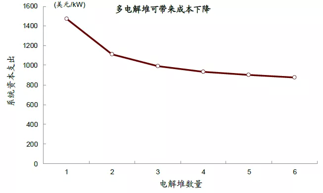 ?規(guī)?;耗壳半娊獠壑茪溲b置規(guī)模普遍較小,通過將多電解槽堆組合以增加電解槽系統(tǒng)整體容量可有效降低系統(tǒng)單位資本支出;同時(shí)制造端規(guī)?;a(chǎn)亦可實(shí)現(xiàn)有效降本。