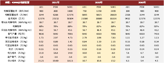 從市場來看,假設(shè)2060年以電解水方法制氫需求為1.3億噸氫氣,假設(shè)采用不同種類的電解水裝置,據(jù)我們測算,AEC/PEM/SOEC電解水裝置市場空間分別為2.2/2.5/2.2萬億元,基本相近,也就是2060年電解水裝置市場超2萬億元。
