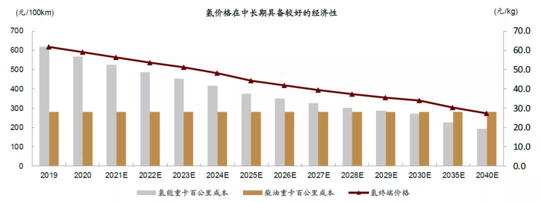我們預(yù)計(jì)終端氫價(jià)格將在2030年下降至35元/kg以下,并在2050年降至約20元/kg