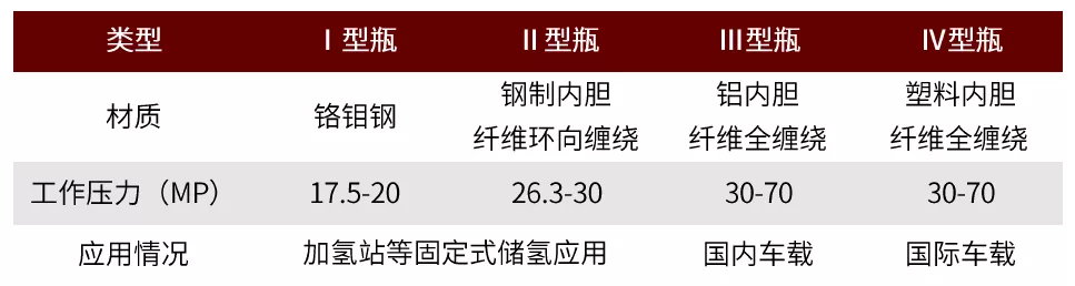 對(duì)于高壓氣態(tài)儲(chǔ)氫,國內(nèi)儲(chǔ)氫瓶處于三代技術(shù),國外主流為四代技術(shù)。從一型瓶到四型瓶,工作壓力逐漸增大,所用材料質(zhì)量逐漸減輕,同時(shí)隨著質(zhì)量降低和性能提升,三型瓶和四型瓶實(shí)現(xiàn)了從固定式到移動(dòng)式的轉(zhuǎn)變。