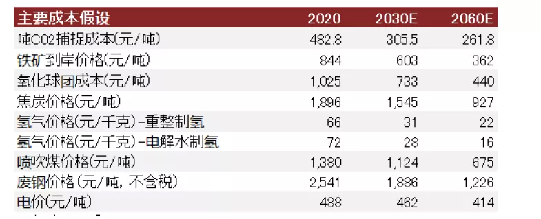我們認(rèn)為2060年煉鋼主要原材料成本均有望降低。成本方面,普通高爐主要原料為鐵礦石、焦炭、噴吹煤、和廢鋼,富氫高爐主要為鐵礦石、焦炭、廢鋼、氫氣,普通電爐主要為廢鋼、石墨電極,氣基豎爐主要為氫氣、其他還原氣、氧化球團(tuán)等。我們預(yù)計(jì)由于供應(yīng)量增加、需求降低、供需格局變化等原因,未來主要原材料成本均有望下降。我們測算鐵礦石/焦炭/廢鋼/電解水制氫價(jià)格2030年較2020年分別減少28%/19%/26%/61%,2060年較2020年分別減少57%/51%/52%/78%。