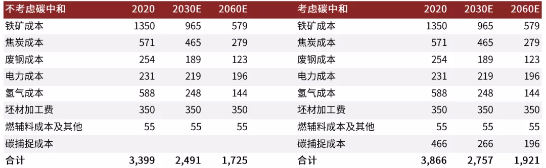 在考慮碳中和情況下,我們認(rèn)為2060年普通電爐噸鋼成本有望最低。隨著廢鋼和電力成本下降,據(jù)我們測算,在考慮碳中和情況下,2060年普通電爐噸鋼成本有望較2020年下降46%;隨著鐵礦石和焦炭成本下降,在考慮碳中和情況下,2060年普通高爐噸鋼成本有望較2020年下降47%。在不考慮碳中和情況下,2060年普通高爐噸鋼成本均最低,為1698元,但考慮碳中和情況下,2060年普通高爐成本將攀升至1986元,成為成本最高的選擇。普通電爐噸鋼成本受碳中和影響較小,考慮碳中和情況下2060年普通電爐噸鋼成本最低為1860元。