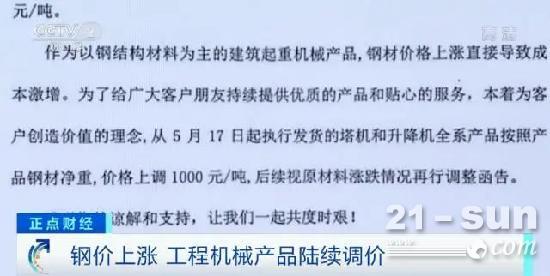 深圳市榕樹投資管理有限公司研究部主管 李仕鮮:主要是受供需兩端的影響,這些工程機械的需求量有較大幅度的提升,但成本上來說,主要的原材料像鋼材或者說鐵礦石,最近來說出現(xiàn)了比較大幅的漲價。所以這些工程機械廠商近期出現(xiàn)了調(diào)整出廠價的動作。