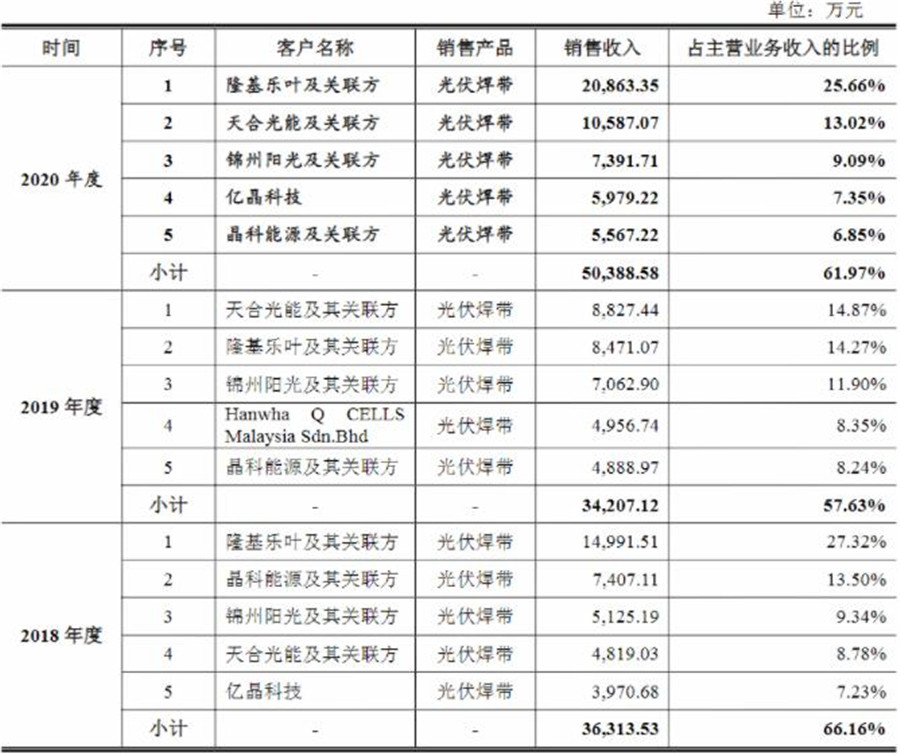 據(jù)宇邦新材招股說(shuō)明書(shū)顯示,其已獲得龍頭企業(yè)認(rèn)可,近三年公司最大客戶分別為隆基股份跟天合光能,兩者都是我國(guó)排名前五的組件龍頭。其它客戶例如錦州陽(yáng)光、億晶科技和晶科能源,也是龍頭企業(yè),前五大客戶占主營(yíng)業(yè)務(wù)收入比例連續(xù)三年都在60%左右,合作比較穩(wěn)定。