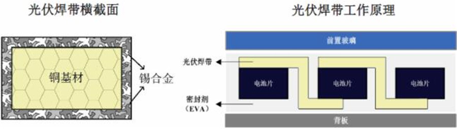 光伏焊帶應(yīng)用于光伏電池片的串聯(lián)或并聯(lián),發(fā)揮導(dǎo)電聚電的重要作用,以提升光伏組件的輸出電壓和功率。其品質(zhì)優(yōu)劣直接影響光伏組件電流的收集效率,對(duì)光伏組件功率和光伏發(fā)電系統(tǒng)效率的影響較大。