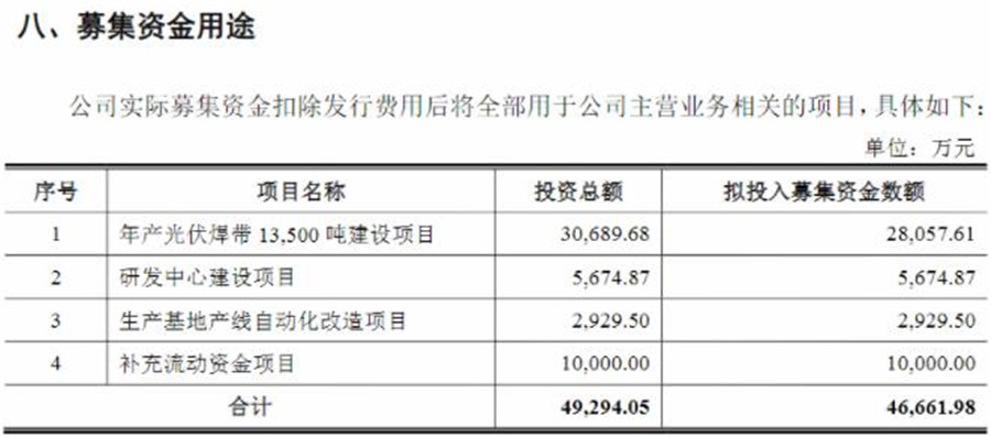 據(jù)招股說(shuō)明書(shū)顯示,宇邦新材擬募資4.67億元,將用于年產(chǎn)光伏焊帶13500噸建設(shè)項(xiàng)目,擬投入募資金額約2.8億元,占比約60%;研發(fā)中心建設(shè)項(xiàng)目,擬投入募資金額約5674.87萬(wàn)元,占比約12%;生產(chǎn)基地產(chǎn)線自動(dòng)化改造項(xiàng)目,擬投入募資金額2929.5萬(wàn)元,占比約6.2%;補(bǔ)充流動(dòng)資金項(xiàng)目,擬投入募資金額1億元,占比約21.4%。