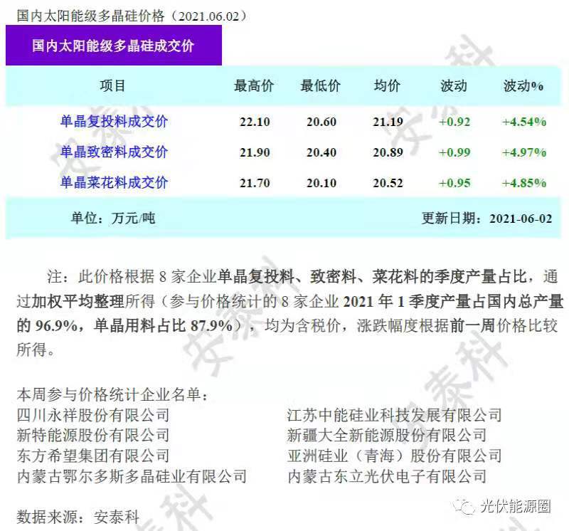 5月26日,硅業(yè)分會(huì)發(fā)布最新硅料價(jià)格,國(guó)內(nèi)單晶復(fù)投料價(jià)格區(qū)間在20.0-20.5萬(wàn)元/噸,成交均價(jià)為20.27萬(wàn)元/噸;單晶致密料價(jià)格區(qū)間在19.7-20.2萬(wàn)元/噸,成交均價(jià)為19.90萬(wàn)元/噸。