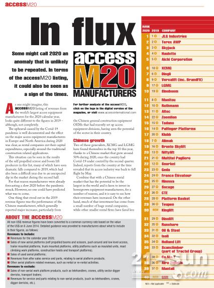 《國際高空作業(yè)機械》顯示,2020年受全球新冠疫情影響,歐美等主要高空作業(yè)機械制造商銷量受影響明顯,而得益于中國政府對新冠疫情有效而強力的控制,中國經(jīng)濟快速的恢復,中國高空作業(yè)機械制造商異軍突起,成績亮眼。