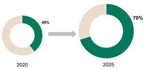 為支持全球能源轉(zhuǎn)型和可持續(xù)發(fā)展,勝科致力于將可持續(xù)解決方案資產(chǎn)的利潤貢獻(xiàn)從目前的40%到2025年增長為70%。到2025年,可再生能源資產(chǎn)的目標(biāo)為實現(xiàn)30%的年均復(fù)合增長率,綜合性城鎮(zhèn)解決方案資產(chǎn)為10%。