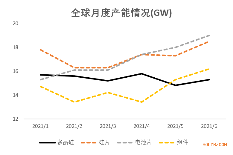 2021年4月,由于硅片緊缺率不足、終端需求疲軟等因素,全球電池電池片產能左右下降明顯,目前產能保持在75%。