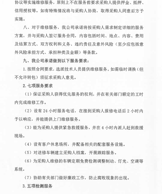 1、承諾維修時限:大修7天內(nèi);二級維護(hù)2天內(nèi);一級維護(hù)1天內(nèi)完成。