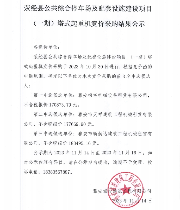滎經(jīng)縣公共綜合停車場(chǎng)及配套設(shè)施建設(shè)項(xiàng)目(一期)塔式起重機(jī)競(jìng)價(jià)采購(gòu)結(jié)果公示