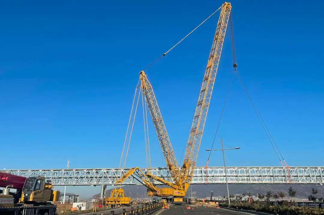 該項目包含五段鋼結構構件,其中CD段跨熱力管道需趴臂調整角度,EF段長90米約170噸重,對機械、人員協(xié)調配合有較大考驗。在吊裝開始前,項目部組織了多次專家評審,根據現場施工條件以及地基承載力驗算,最終確定采用1000噸履帶吊進行鋼結構吊裝作業(yè),施工全過程可控、在控。