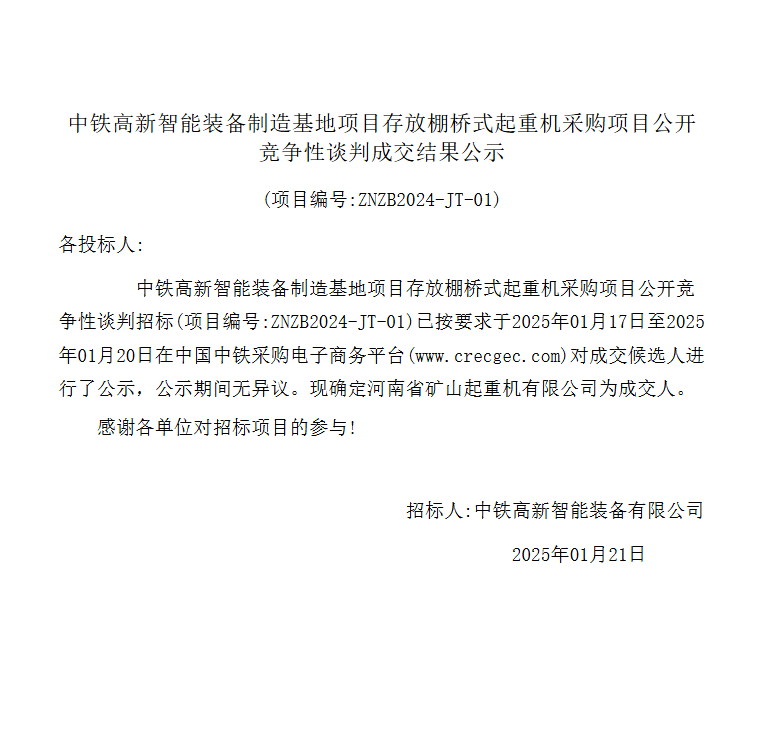 移動版:中鐵高新智能裝備制造基地項目存放棚橋式起重機采購項目公開競爭性談判成交結(jié)果公示