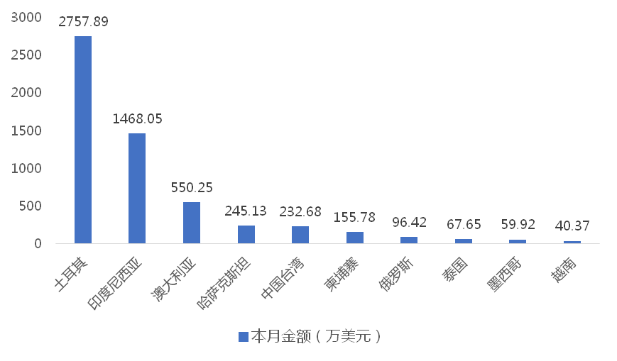 2025年6月,我國龍門式起重機(jī)出口金額排名前十位的國家/地區(qū)分別為土耳其、印度尼西亞、澳大利亞、哈薩克斯坦、中國臺灣、柬埔寨、俄羅斯、泰國、墨西哥、越南,合計占我國該產(chǎn)品出口總額的94.64%。其中,向土耳其出口最多,金額為2757.89萬美元,占出口總額的46.00%。
