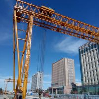 橋式起重機是橫架于車間、倉庫和料場上空進行物料吊運的起重設(shè)備。由于它的兩端坐落在高大的水泥柱或者金屬支架上,形狀似橋。橋式起重機的橋架沿鋪設(shè)在兩側(cè)高架上的軌道縱向運行,可以充分利用橋架下面的空間吊運物料,不受地面設(shè)備的阻礙。它是使用范圍**廣、數(shù)量**多的一種起重機械。